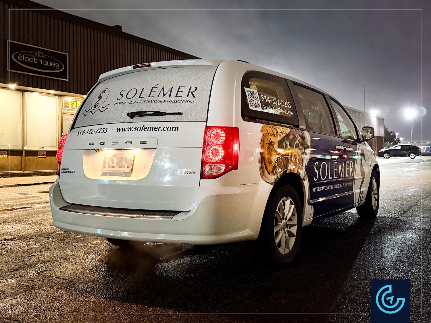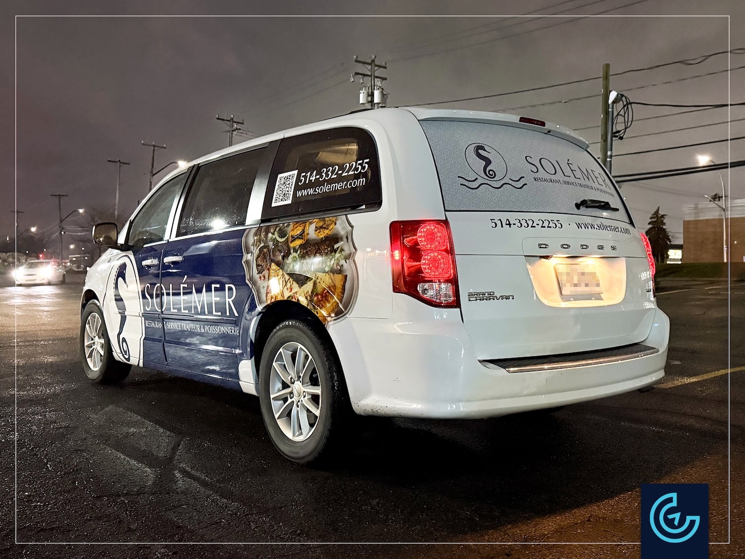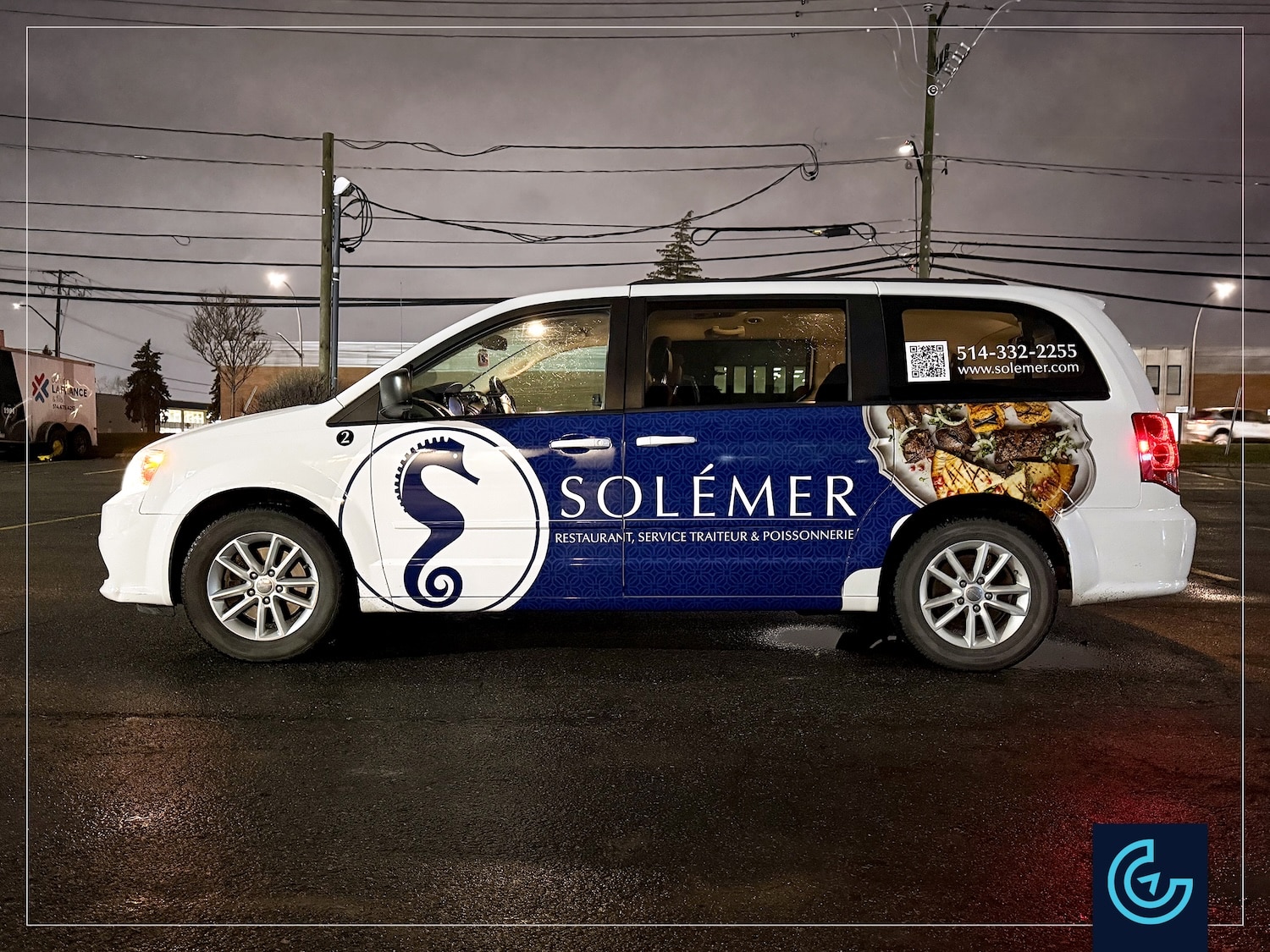 Accueil » Portfolios » Van/Minivan » Minivan partial wrap and lettering for a restaurant and seafood market: Solémer