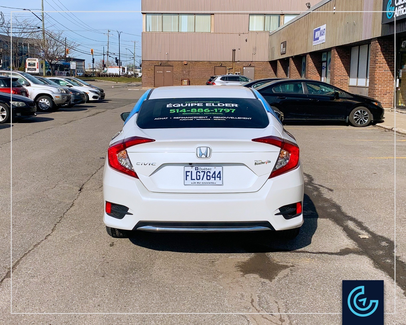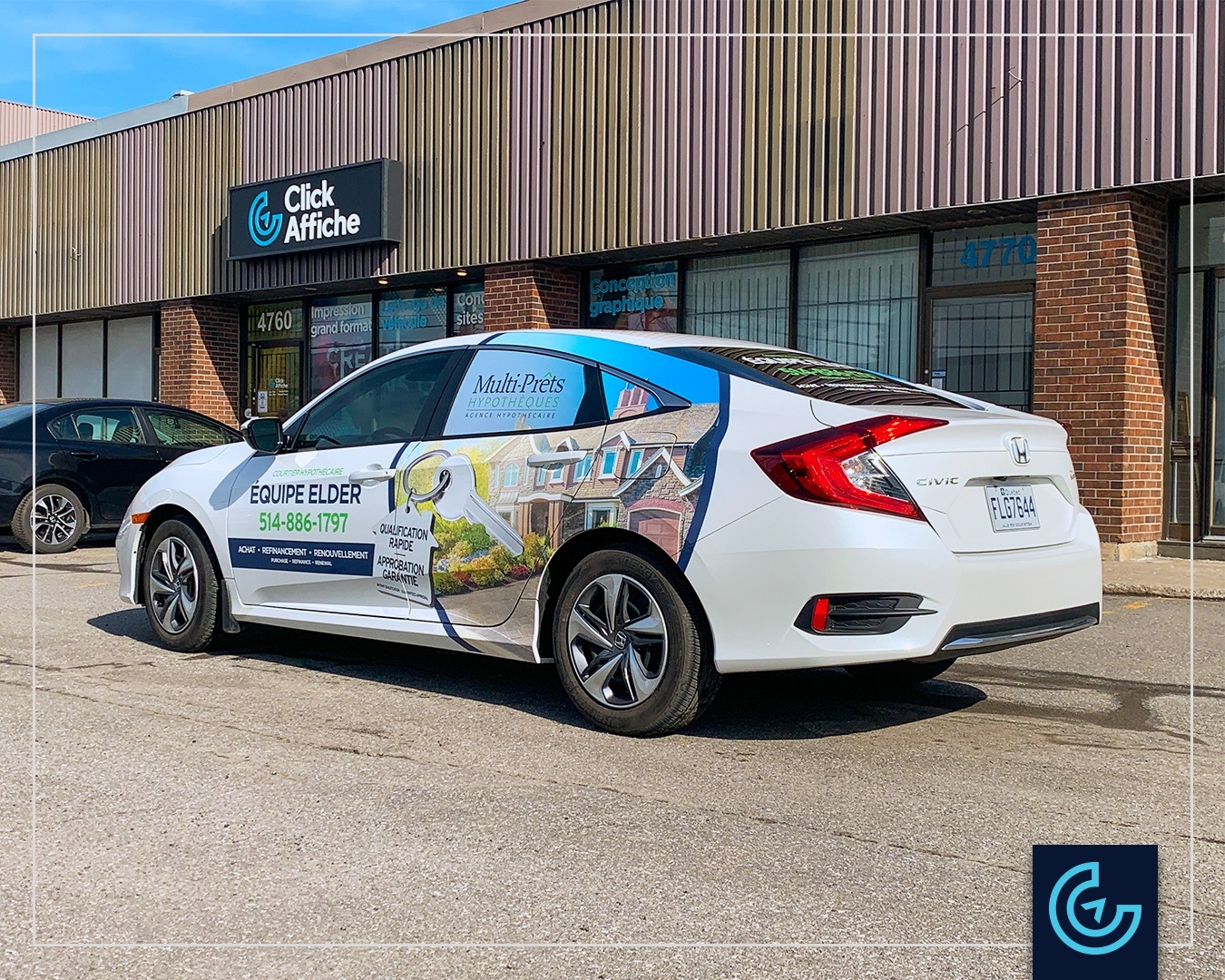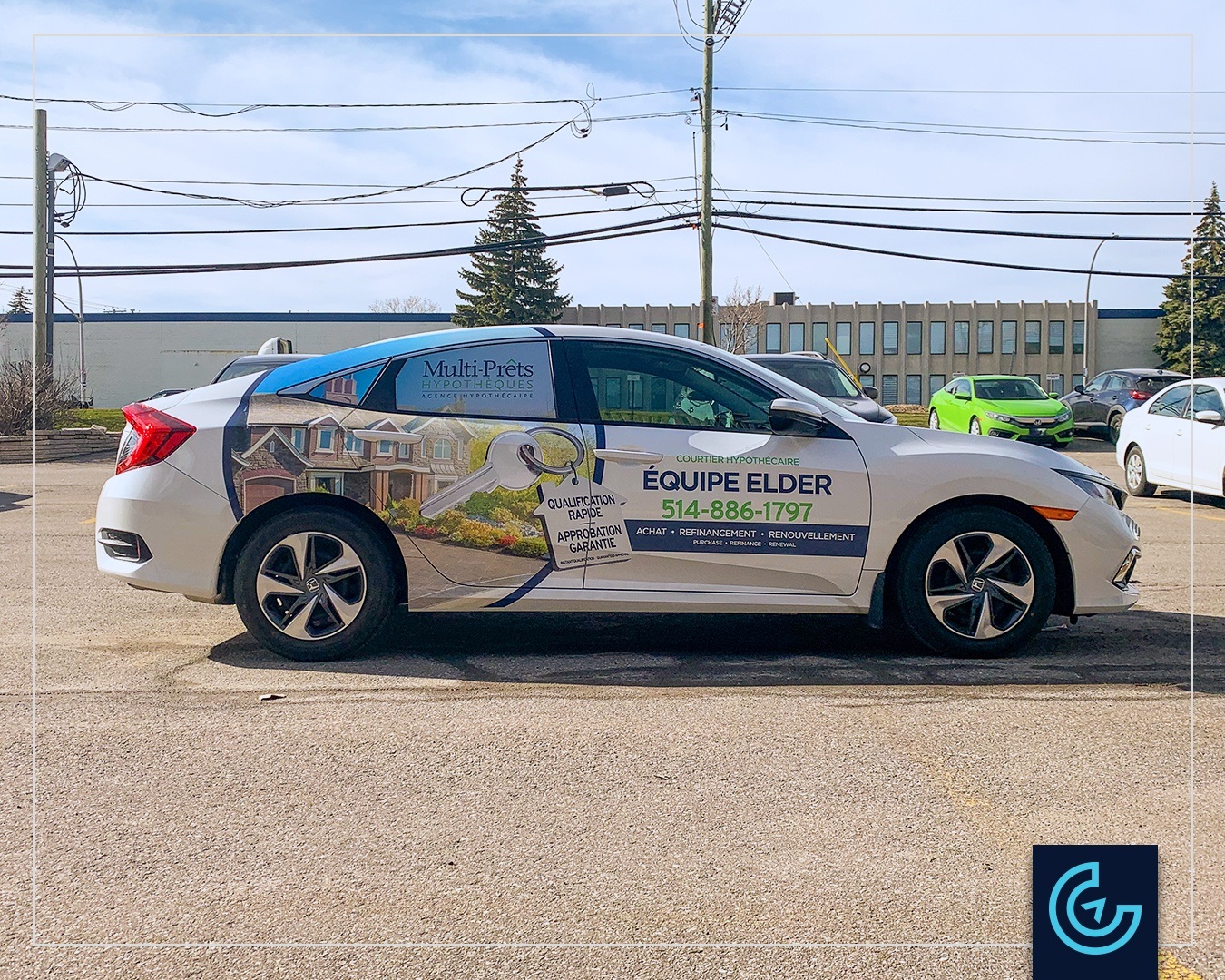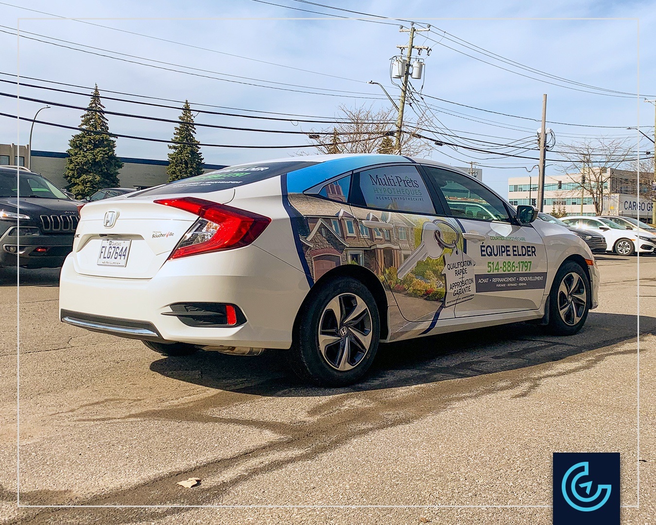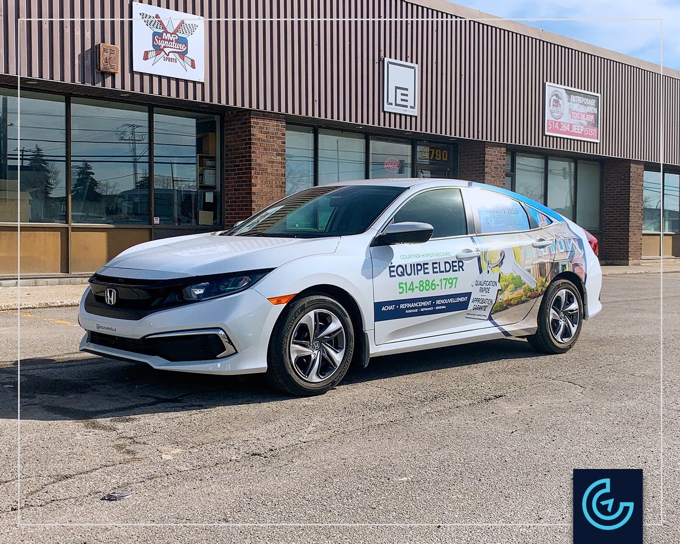 Accueil » Portfolios » Sedan/SUV » Partial wrap and vehicle lettering on a sedan car Honda: Elder Assurances et Services Financiers