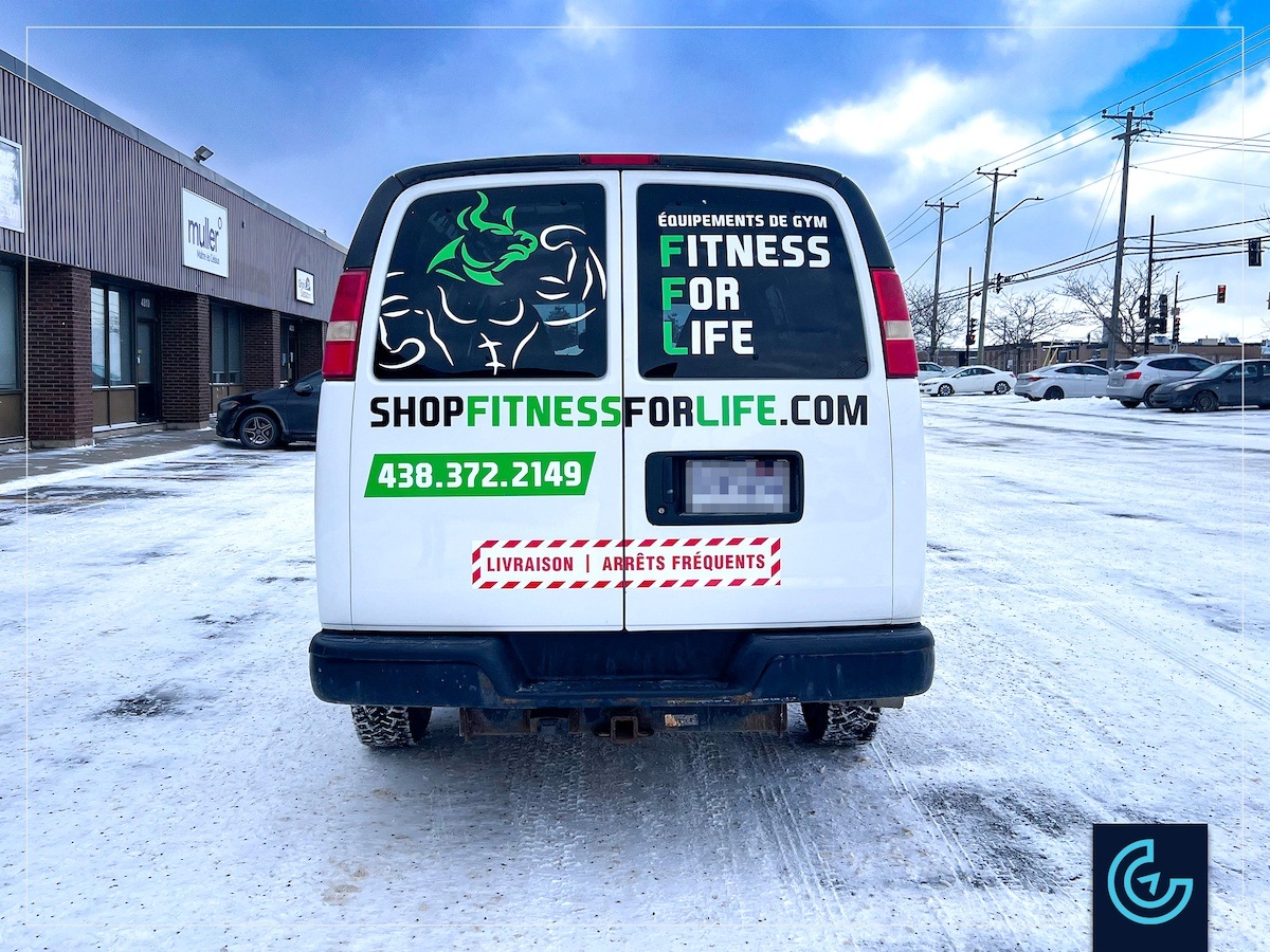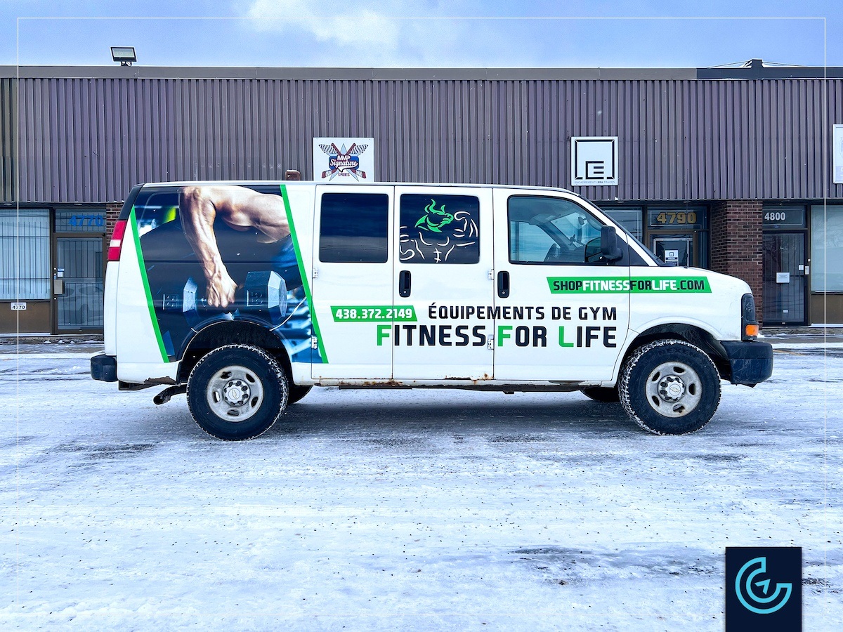 Accueil » Portfolios » Van/Minivan » Vehicle lettering and partial wrap for gym equipments seller: Fitness For Life