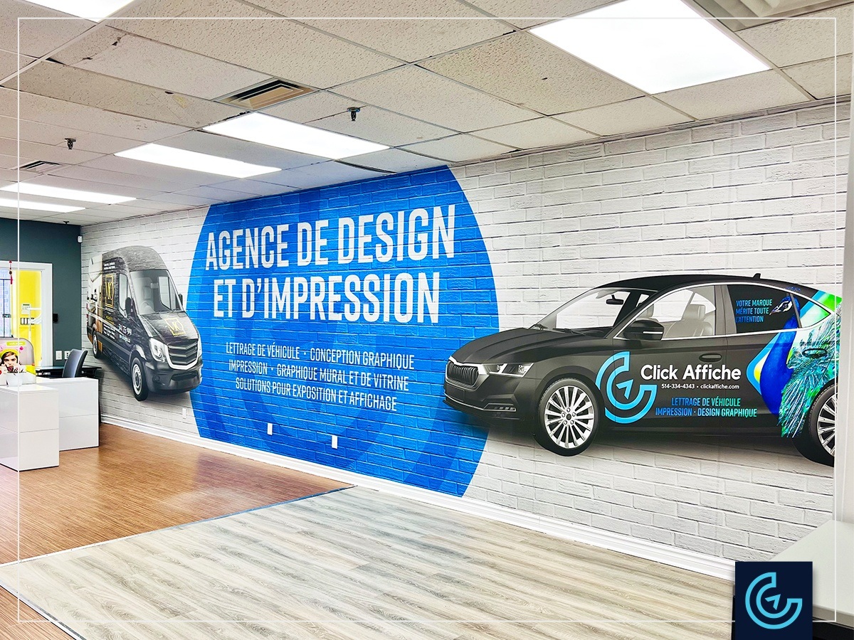 Office branding wall graphics designed, printed and installed for the design and printing agency Click Affiche