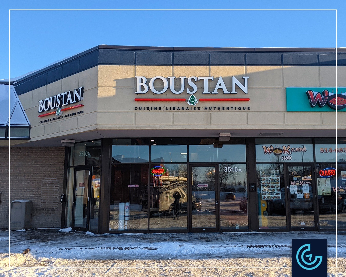 Accueil » Backlit storefront sign in channel letters for the restaurant Boustan in DDO » Backlit storefront sign in channel letters for the restaurant Boustan in DDO