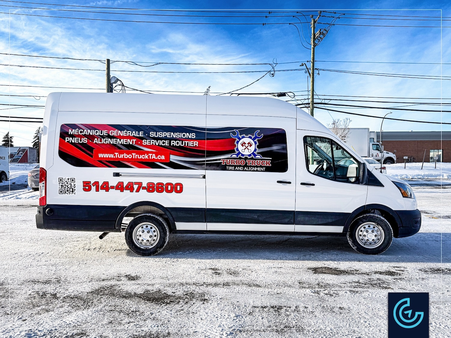 Habillage partiel et lettrage de véhicule d’un fourgon Ford Transit 2025, version allongée avec un toit surélevé pour l’atelier de réparation de camions Turbo Truck Tire & Alignment.