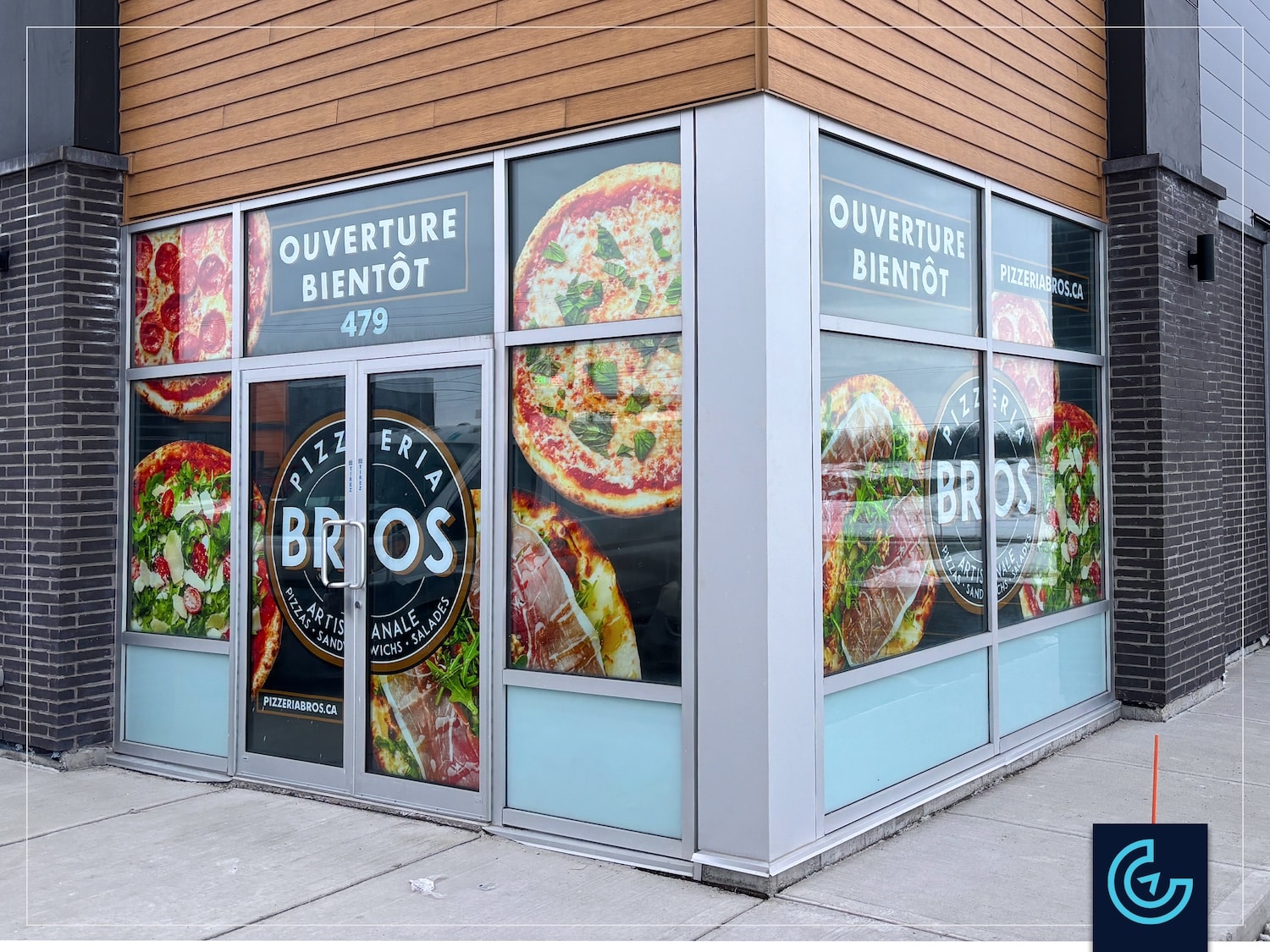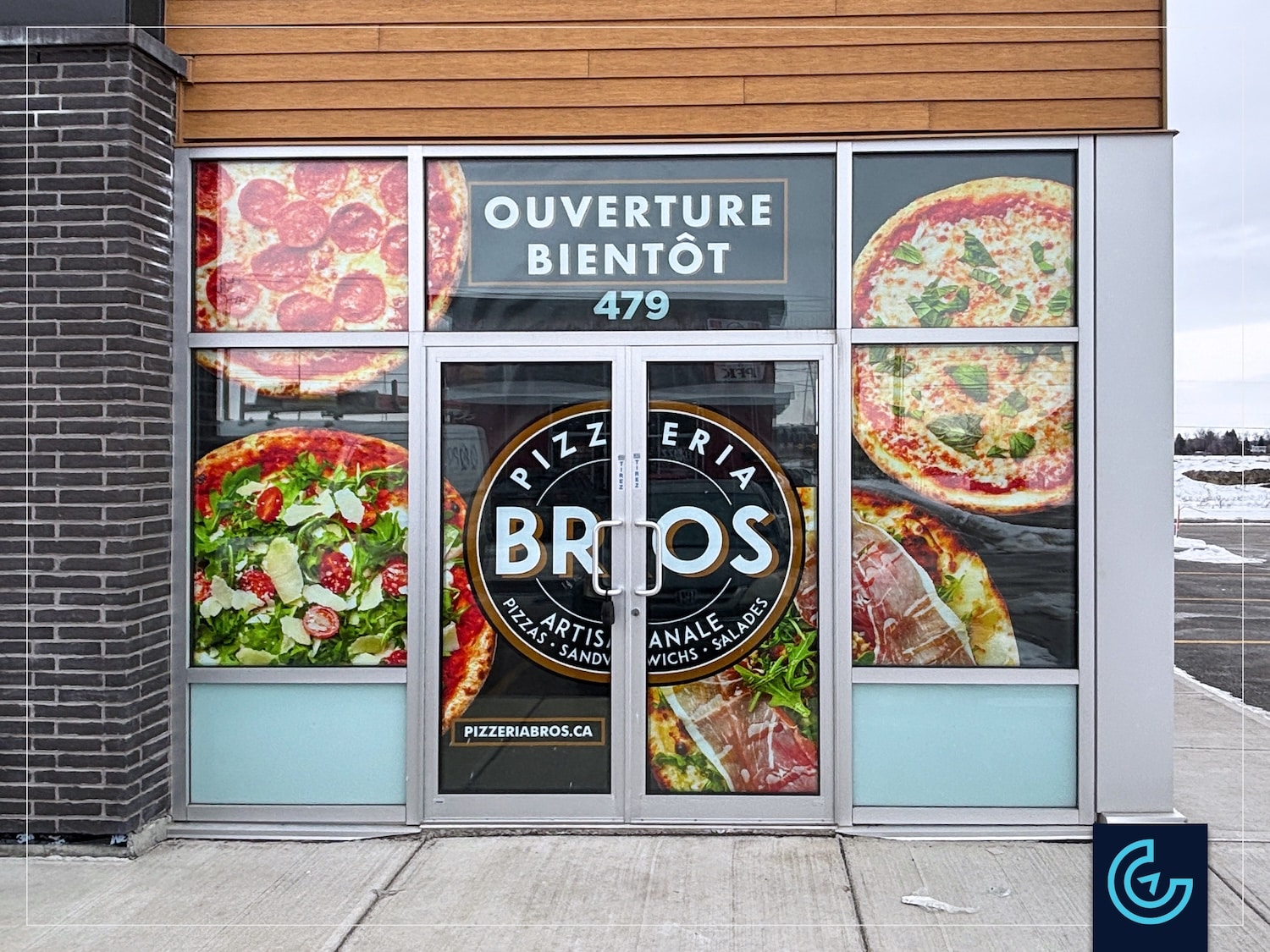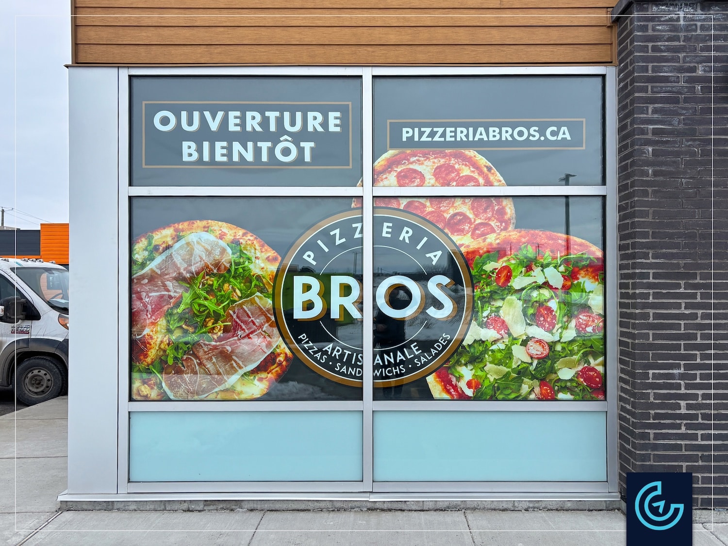 Accueil » Portfolios » Graphiques vitrines/fenêtres » Graphiques de vitrine temporaires de type palissade pour une franchise de restaurant: Pizzeria Bros (Beloeil)