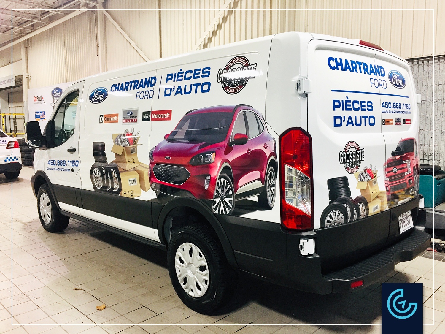 Accueil » Portfolios » Lettrage de véhicule » Wrap complet de véhicule sur un van Ford Transit: Chartrand Ford