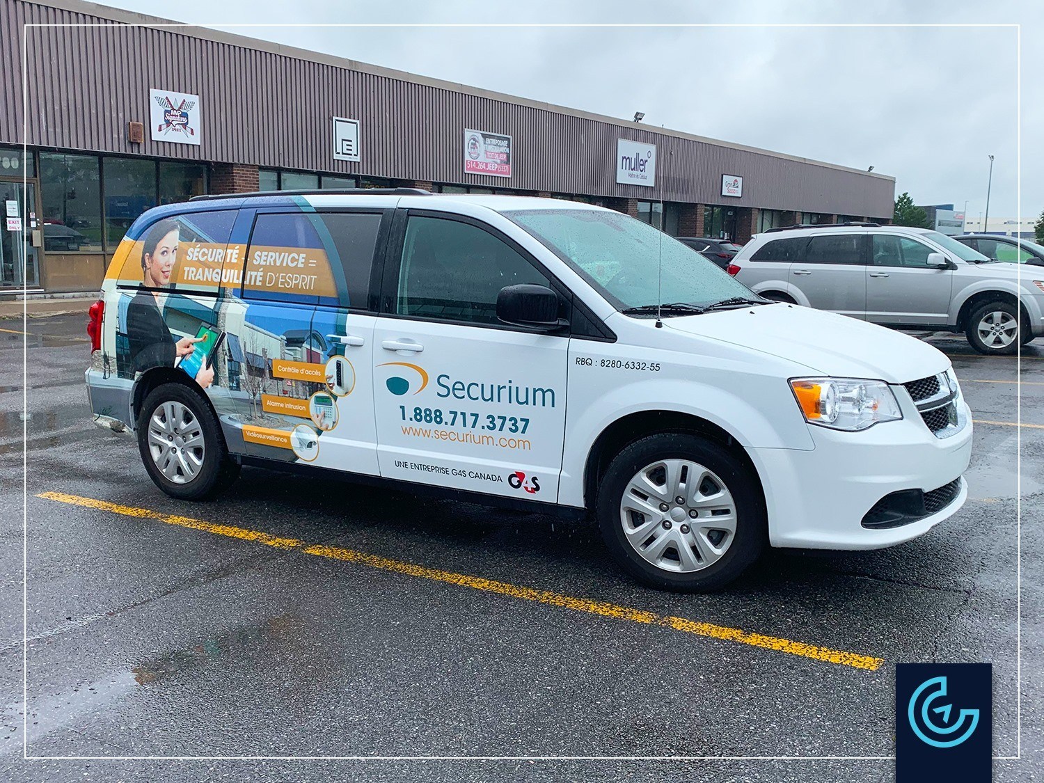 Accueil » Portfolios » Lettrage de véhicule » Wrap partiel et lettrage de véhicule sur un van Dodge Caravan pour Securium